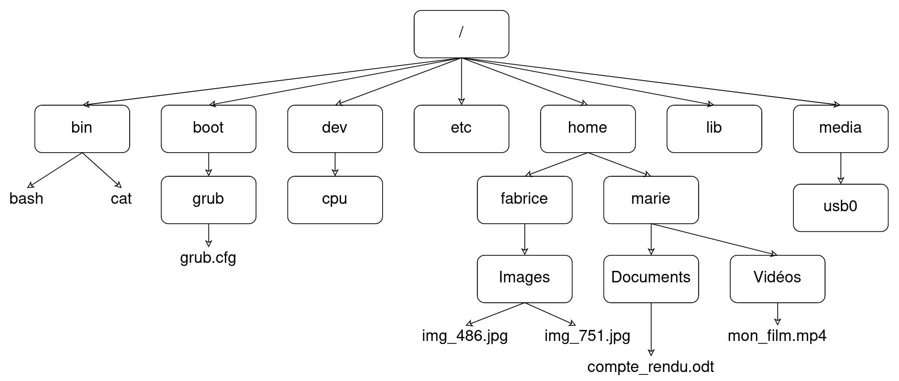Dans le schéma ci-dessus on trouve des répertoires (noms entourés d’un rectangle, exemple : “home”) et des fichiers (uniquement des noms “grub.cfg”).