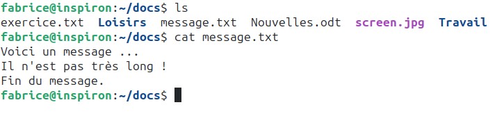 La commande cat permet d’afficher dans la console le contenu d’un fichier.