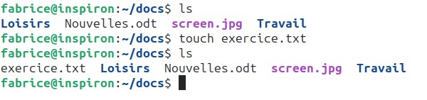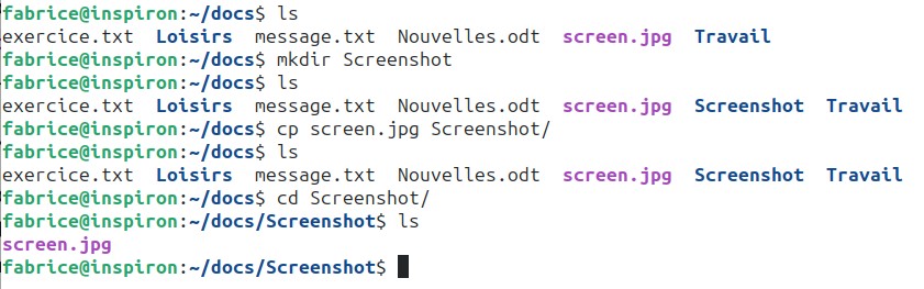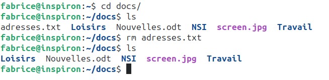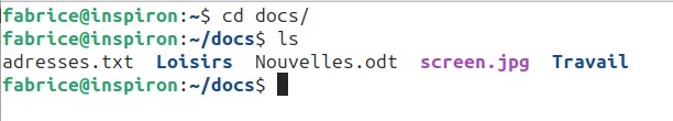 Dans l’exemple ci-dessus, depuis le répertoire personnel de l’utilisateur “fabrice”, nous passons dans le répertoire “Documents” à l’aide d’un cd Documents, puis nous affichons le contenu de ce répertoire “Documents” à l’aide de la commande ls. Nous trouvons dans le répertoire “Documents” : 3 fichiers (adresses.txt, Nouvelles.odt et screen.jpg) et deux répertoires (Travail et Loisirs).