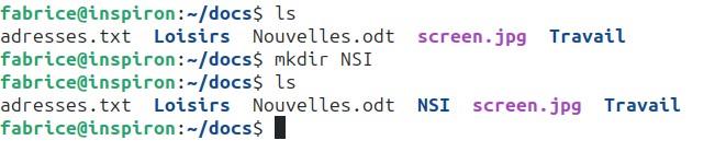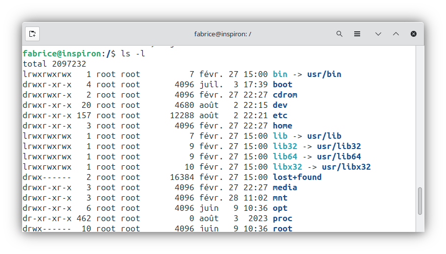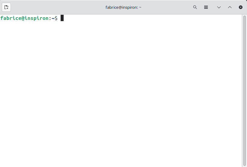 Sur l’image ci-dessus, nous voyons le terminal de l’utilisateur “fabrice” qui utilise un ordinateur qui se nomme “inspiron” (“fabrice@inspiron”).