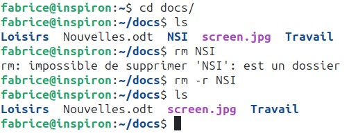 ATTENTION : cette commande est relativement “dangereuse”, il faut donc la manipuler prudemment. Par exemple la commande rm * efface tous les fichiers du répertoire courant (le * signifie tous les fichiers et tous les répertoires). Pour effacer tous les fichiers et tous les répertoires présents dans le répertoire courant il faut donc utiliser rm -r *.
