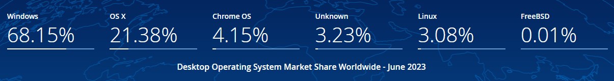 Voici la répartition des parts de marché des principaux OS utilisés sur les ordinateurs de bureau en 2023 (source : LEPTIDIGITAL) :