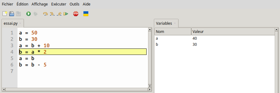 Selon l’éditeur utilisé pour écrire le programme, il est souvent possible d’exécuter un programme an mode débogage (debug), pas à pas, et d’observer en temps réel l’évolution du contenu des variables. Ces fonctionnalités facilitent grandement la mise au point d’un programme.