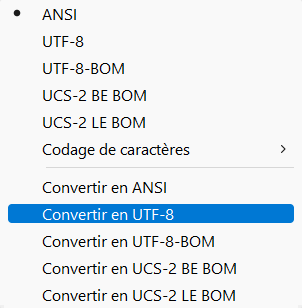 Pour convertir un fichier d’un encodage à un autre, on peut utiliser l’éditeur Notepad++ (sous Windows) ou son clone Notepadqq (sous Linux) dans lequel on trouve un menu “Encodage” comprenant par exemple une commande “convertir en UTF-8”.