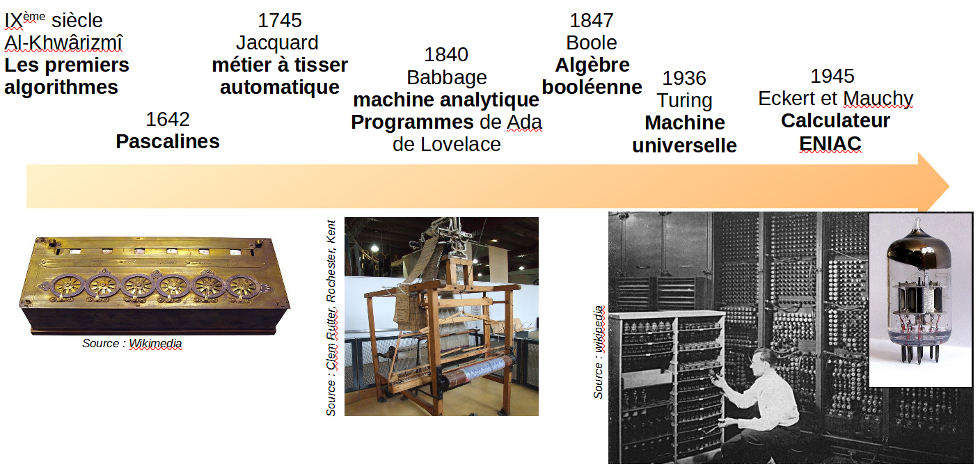 Une première date est la publication par le mathématicien Muhammad Al-Khwârizmî d’une classification des algorithmes existants au 9ème siècle. Le mot algorithme est issu de son nom.