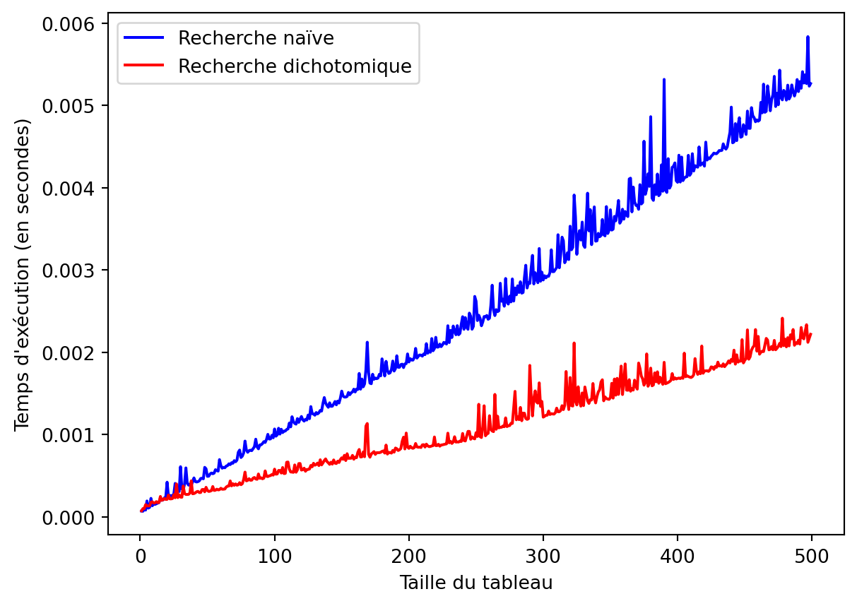 L’algorithme de recherche dichotomique est donc en \(\mathcal{O}(\log n)\). On parle de complexité logarithmique. Cette complexité est meilleure que la complexité linéaire.