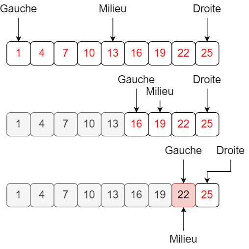 On répète donc l’opération sur la partie du tableau située à droite (gauche=7 et droite=8). On obtient le tableau [22,25] et on cherche la valeur 22. L’élément du milieu de ce tableau vaut 22 (milieu=7), qui est égal à 22. On a donc trouvé la valeur recherchée et l’algorithme est terminé en trois étapes.