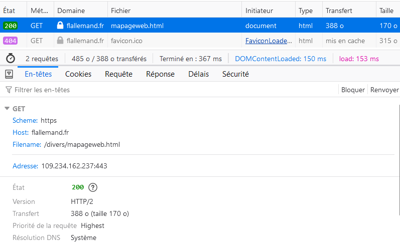 Nous voyons qu’en fait deux requêtes ont été envoyées, car le navigateur charge automatiquement l’icône du site.