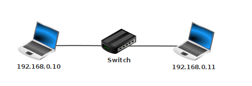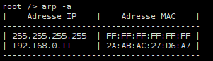 192.168.0.10d’adresse MACBC:81:81:42:9C:31à une machine192.168.0.11d’adresse MAC2A:AB:AC:27:D6:A7à travers un switch.