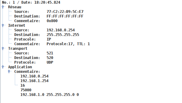 On peut observer dans Filius cette trame, en se positionnant sur l’interface 192.168.1.254 du routeur, ou sur 192.168.1.1 :