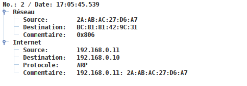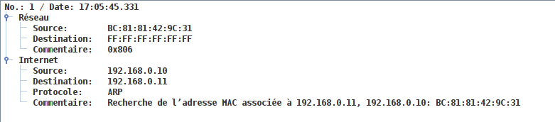 Cette première ligne est une requête ARP. ARP est un protocole qui s’interface entre la couche 3 / réseau (appelée dans la capture d’écran Internet) et la couche 2 / liaison (appelée dans la capture d’écran Réseau). Comme indiqué dans le commentaire, elle consiste à un appel à tout le réseau : “Est-ce que quelqu’un ici possède l’IP 192.168.0.11 ?