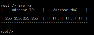 La commande arp -a effectuée dans un terminal de la machine 192.168.0.10 nous permet de voir qu’elle ne connaît encore personne dans son sous-réseau. La table de correspondance IP ⮀ MAC ne contient que l’adresse de broadcast 255.255.255.255, qui permet d’envoyer un message à tout le réseau.