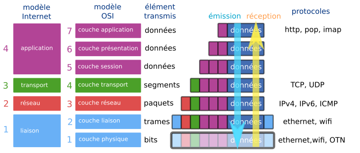 Les protocoles qui interviennent à chaque étape sont organisés en couches. Le modèle de référence pratique est le modèle Internet (ou modèle TCP/IP, 1974), organisé en 4 couches : liaison, réseau, transport, application. Le modèle OSI (1984) en distingue 7, avec une granularité plus fine — c’est le modèle théorique normalisé.