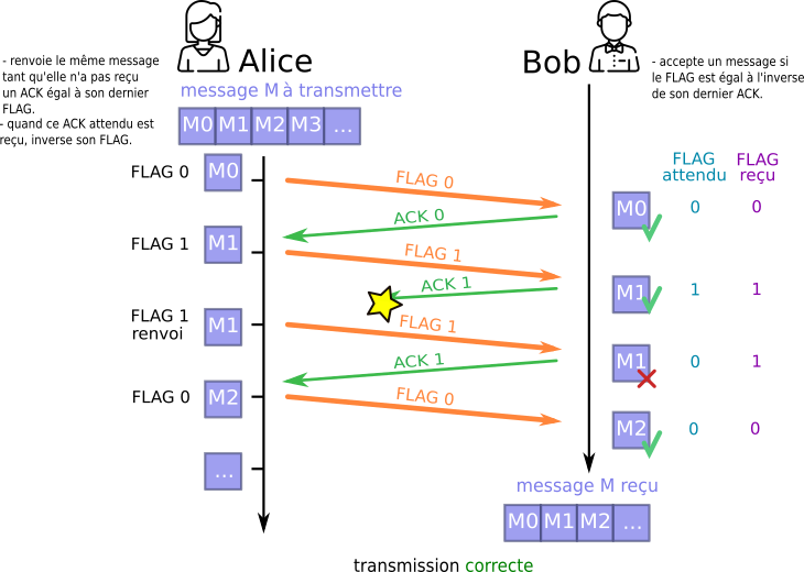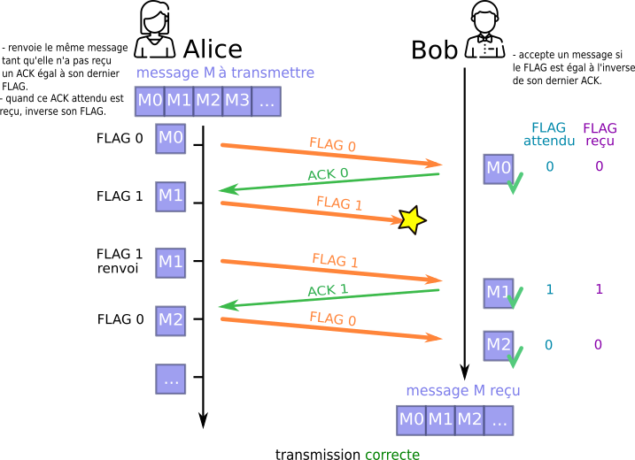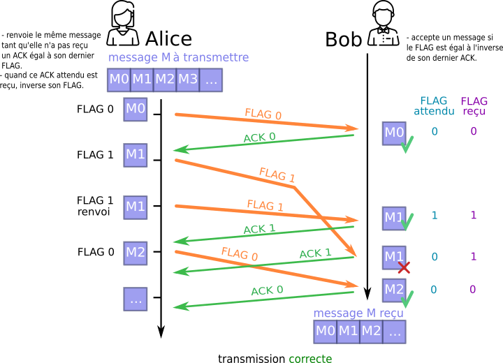 Pour réaliser ceci, Alice va rajouter à chacun de ses sous-messages un bit de contrôle, que nous appelerons FLAG (drapeau). Au départ, ce FLAG vaut 0. Quand Bob reçoit un FLAG, il renvoie un ACK égal au FLAG reçu.