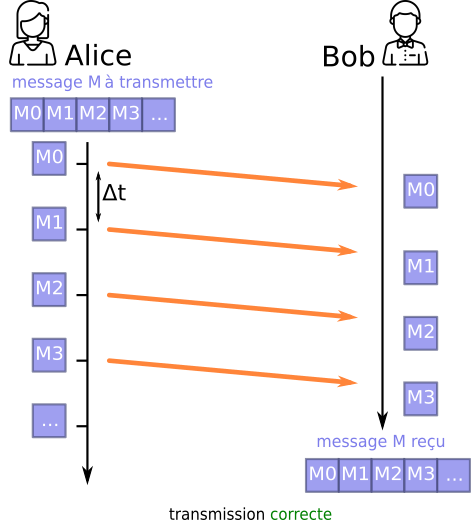 - Alice envoie ses sous-messages à une cadence Δt fixée.