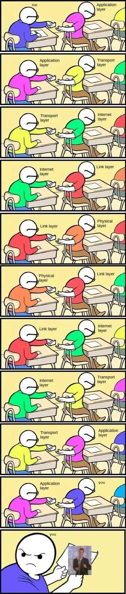 couches 7-6-5 — couches application-présentation-session : Ces couches (réunies dans le modèle Internet en une couche unique «application» ) regroupent les protocoles nécessaires à la bonne mise en forme d’un message (au sens large) avant sa transmission. Ces protocoles peuvent être de nature très différente : protocole HTTP pour la transmisson de pages web, protocole FTP pour le transfert de fichiers, protocoles POP ou IMAP pour le courrier électronique…