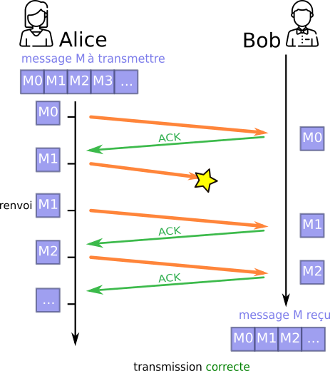 N’ayant pas reçu le ACK consécutif à son message M1, Alice suppose (avec raison) que ce message n’est pas parvenu jusqu’à Bob, et donc renvoie le message M1.