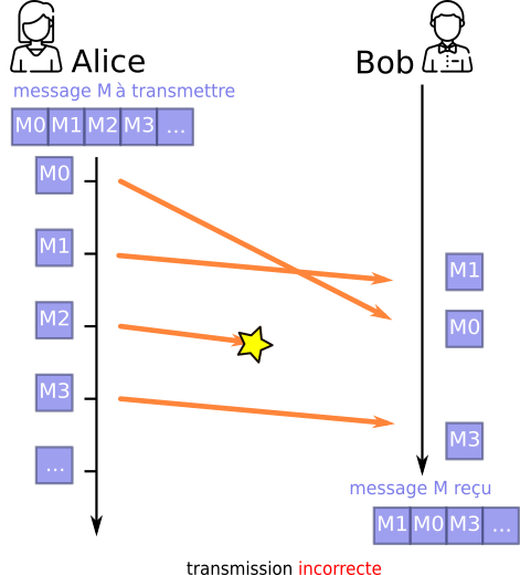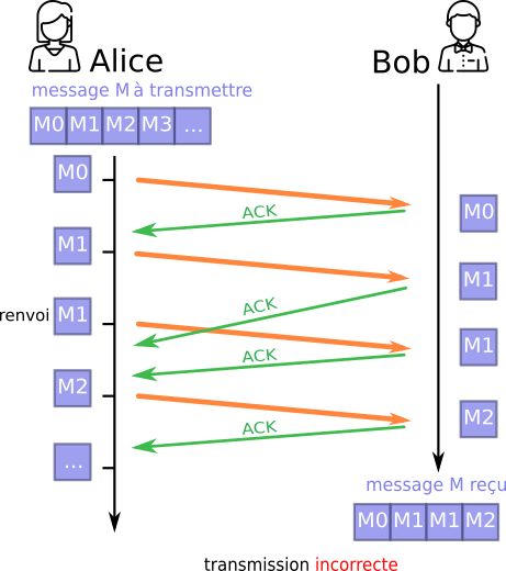 Le deuxième ACK de Bob a mis trop de temps pour arriver (ou s’est perdu en route) et donc Alice a supposé que son sous-message M1 n’était pas arrivé. Elle l’a donc renvoyé, et Bob se retrouve avec deux fois le sous-message M1. La transmission est incorrecte. En faisant transiter un message entre Bob et Alice, nous multiplions par 2 la probabilité que des problèmes techniques de transmission interviennent. Et pour l’instant rien ne nous permet de les détecter.