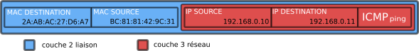 C’est l’encapsulation finale du message. Suivant le protocole Ethernet, les informations sont transmises d’une carte réseau à une autre, grâce à leur adresse MAC (Media Access Controler).